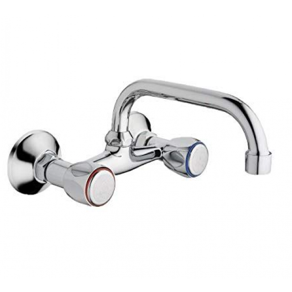 Batería fregadero pared caño alto corto serie Reina, disponible en la anchura de 11 y 15 centímetros, caño giratorio de 18mm y 190 mm de longitud, con filtro atomizador, volante metálico y monturas cerámicas