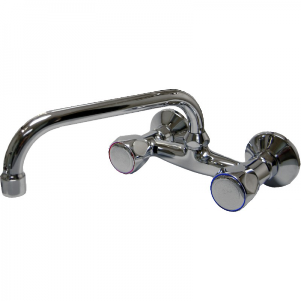 Batería Fregadero a pared caño alto tubo giratorio 18mm y 230mm de longitud con filtro atomizador, monturas con cierre ceramico, volante metalico y excentricas latón niqueladas disponible en 11cm de separación o 15cm separación