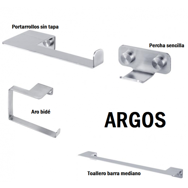 Conjunto accesorios de baño Lowcost pyp Argos, compuesto de 4 piezas: toallero anilla bide - portarrollos sin tapa - percha sebcilla -. toallero barra mediano, materiales utilizados " Acero inoxidable 304 " acabado en acero cepillado. La colección de accesorios pyp unen lo practico con el diseño. BAPLMO000