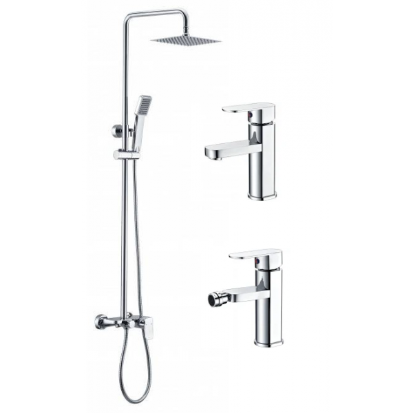 Conjunto tres monomando Liverpool cromado, ducha exterior - Lavabo - Bidét, serie Liverpool. Cromo, Barra ducha extensible de acero inox 87/133cm. Rociador de acero inox redondo 20cm extraplano acabado en cromo y antical. Soporte teléfono regulable en altura. Mango ducha redondo de 3 posiciones. Fabricado en latón y acabado en cromo. Cartucho cerámico de 3,5 cm . Este producto tiene una garantía de 2 años + 3 años de mantenimiento (un total de 5 años).