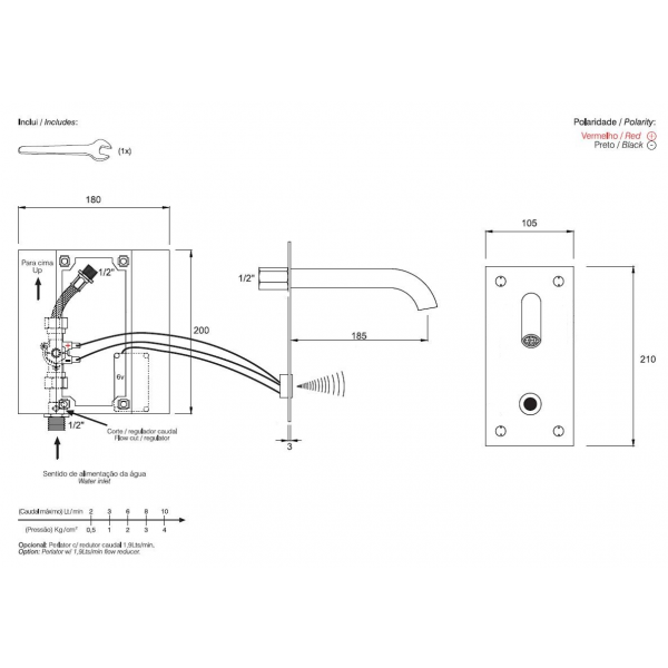 Grifo electrónico lavabo mural empotrado grifdeco CE07 B. Se suministra en versión 6v, fabricado en latón cromado dispone de electroválvula con sensor electrónico de infrarrojos, Conexión mediante rosca macho 1/2". Caja con bateria de litio 6v . Presión de trabajo 0.5 a 8 bar- Caudal 7.5 litros / minuto a 3bar - Temperatura recomendada de trabajo entre 5ºC a 70ºC
