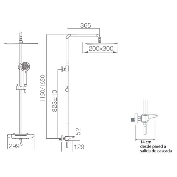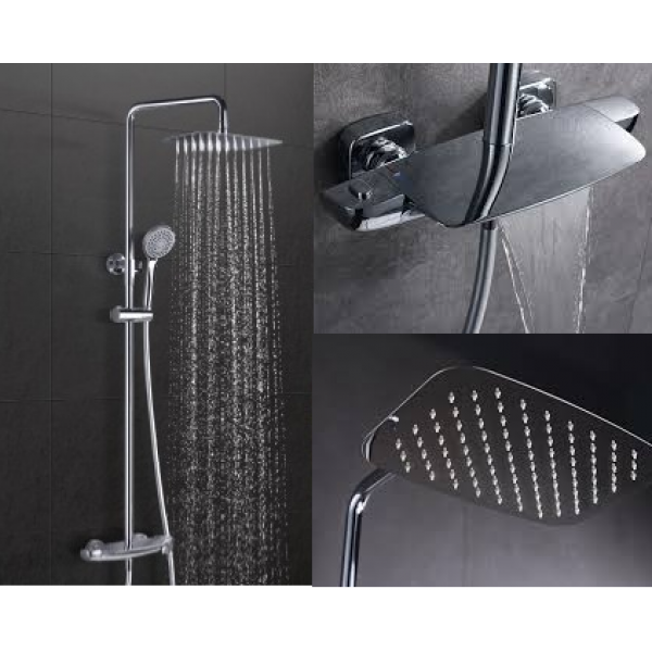 Grifo Baño Cascada ducha termostatico Sidney. Rociador de acero inox,.extraplano cromado y antical ovalado 20 x 30cm, barra ducha extensible de 115 / 165 cm.extraplano, Mango ducha redondo, soporte telefono regulable en altura Griferia termostatica de latón cromado con distribuidor incorporado. Cartucho polimero Vernet